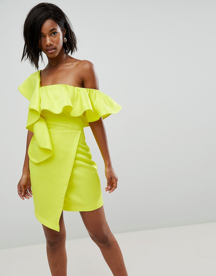 Mini dress by ASOS Collection, Take that dress code up a level, Lined top, Asymmetric neck, Ruffle overlay, Hello, frill seekers, Wrap skirt, Hook and eye closure, Zip back, Close-cut bodycon fit. Score a wardrobe win no matter the dress code with our ASOS Collection. From polished prom to the after party, our London-based design team scour the globe to nail your new-season fashion goals with need-right-now dresses, outerwear, shoes and denim in the coolest shapes and fits.