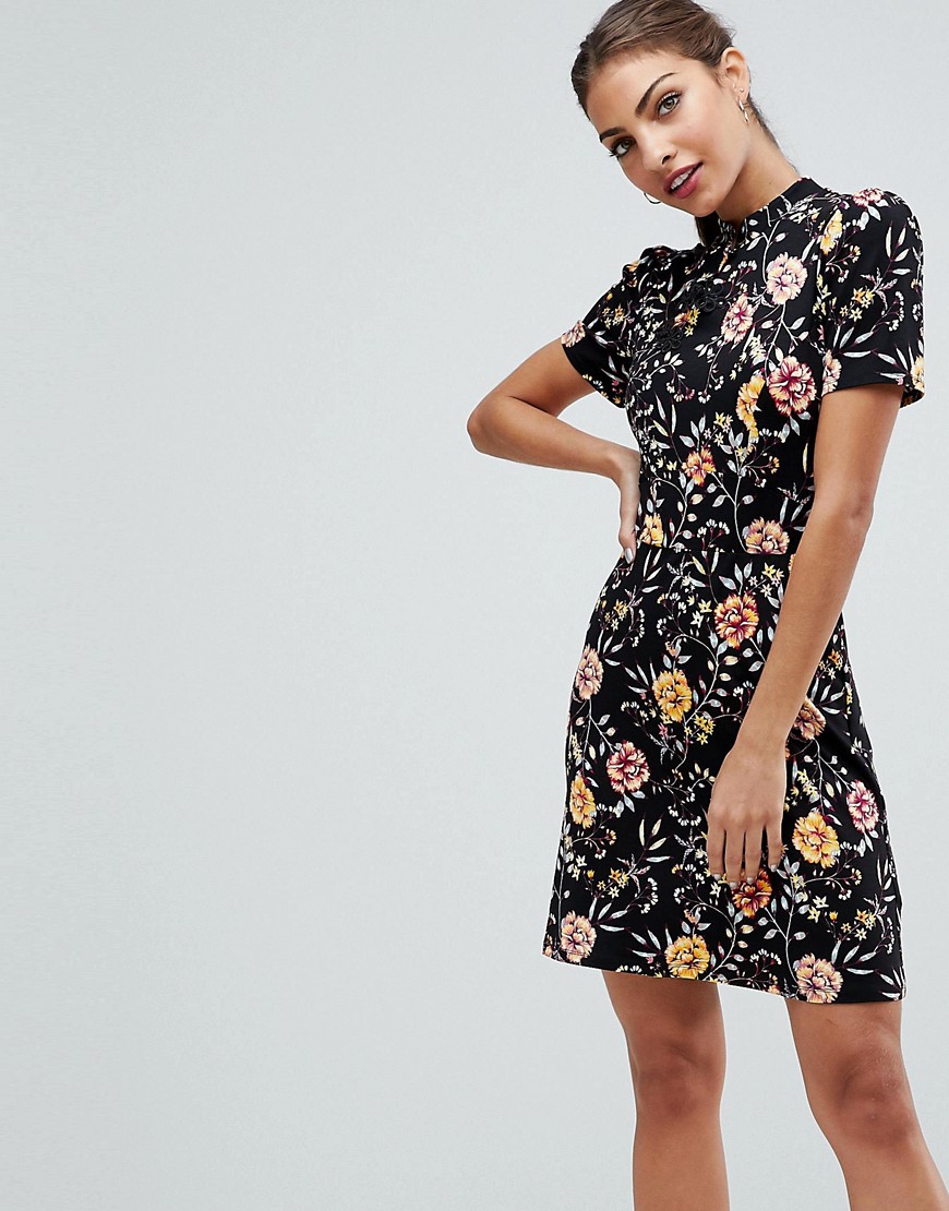 Dress by ASOS Collection, Smooth stretch fabric, Floral print, Band collar, Intricate hook and eye fastening, Short sleeves, Elasticated waist, Mini-length, Regular fit – fits true to size. Score a wardrobe win no matter the dress code with our ASOS Collection. From polished prom to the after party, our London-based design team scour the globe to nail your new-season fashion goals with need-right-now dresses, outerwear, shoes and denim in the coolest shapes and fits.