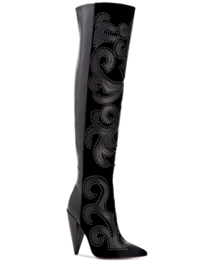 Bcbgmaxazria’s Jolene boots make a strong statement with an over-the-knee silhouette, accented with a stunning swirling, studded pattern at front.