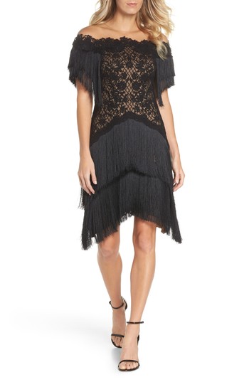 Tiers of swaying fringe lend head-turning movement to an exquisite, shoulder-baring cocktail dress perfect for twirling the night away. Style Name: Tadashi Shoji Off The Shoulder Fringe & Embroidered Mesh Dress. Style Number: 5611514. Available in stores.